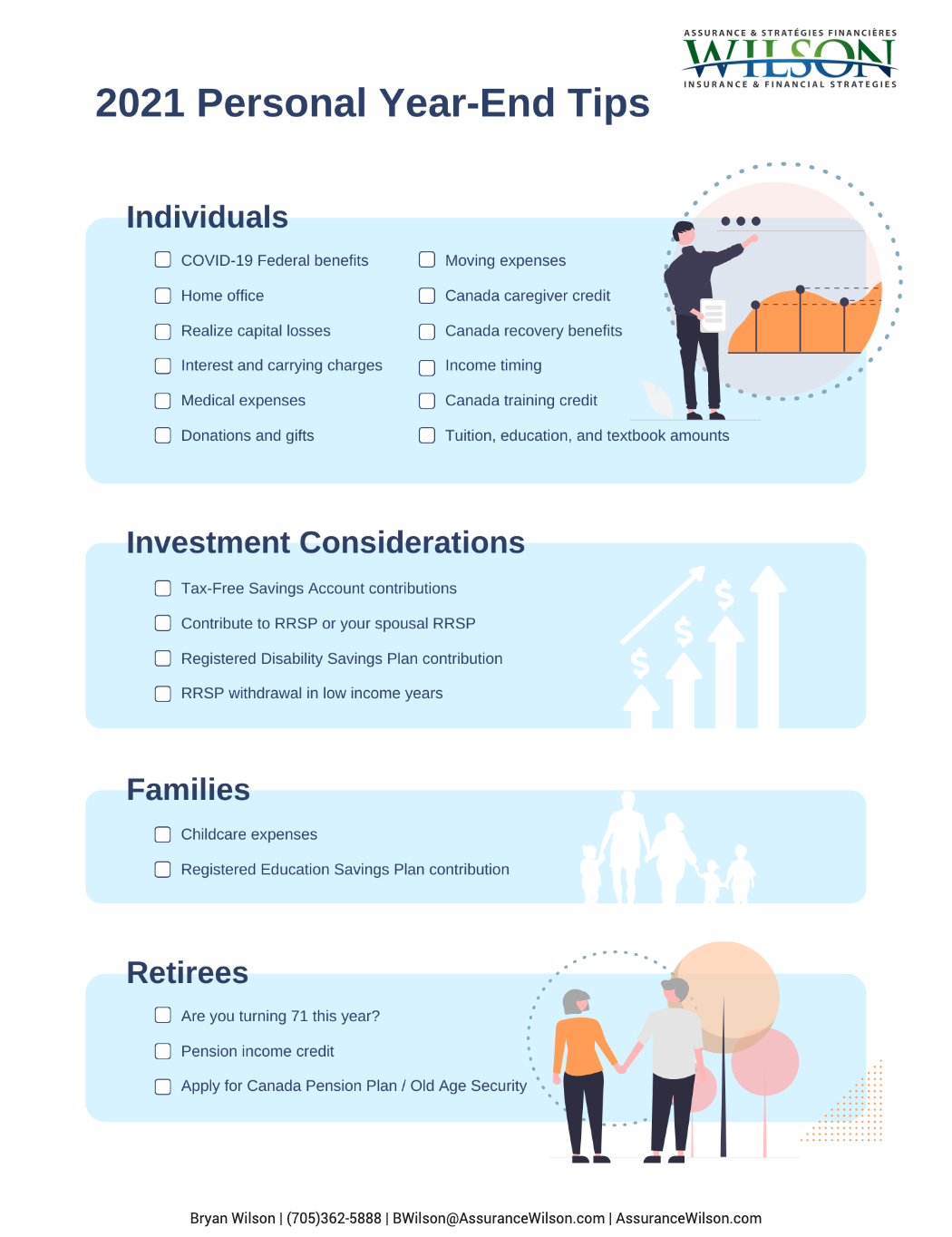 Are you turning 71 this year? If so, you are required to end your RRSP by December 31. You have several choices on what to do with your RRSP, including transferring your RRSP to a Registered Retirement Income Fund (RRIF), cashing out your RSSP, or purchasing an annuity. Talk to us about the tax implications of each of these choices.